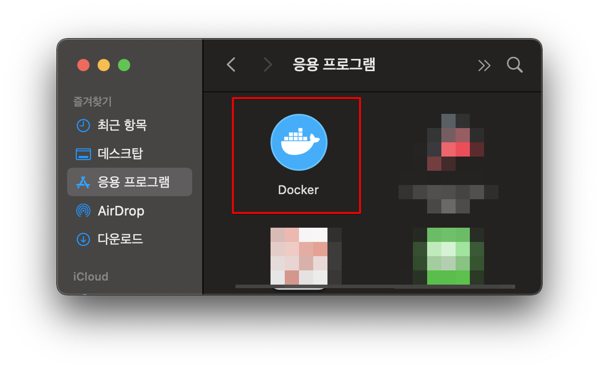 응용 프로그램에서 Docker가 추가된걸 확인 후 더블 클릭하여 실행해줍니다.